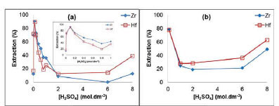 When using sulphuric acid solutions, extractions of >80% were reached both for Zr and Hf. In all cases equilibrium was achieved in less than 25 minutes of contact between the organic and the aqueous phase. Stripping of metals was achieved with >40% separation and 50% extraction using a sodium chloride (0.7 mol/dm3) stripping solution.
