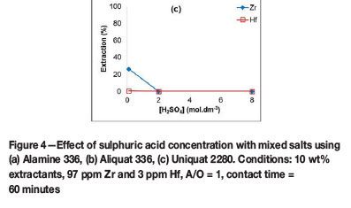 An extraction of 92% was attained at 9 wt% Alamine 336 when extracting from 0.01 mol/dm3 H2SO4 and 87% at 10 wt% Alamine 336 when extracting from 0.1 mol/dm3 H2SO4. Extraction from 0.5 mol/dm3 H2SO4, while also increasing with increasing extractant concentration, had the smallest gradient, resulting in the lowest extraction reaching a maximum of 60% Zr and 41% Hf at 9 wt% Alamine 336. In spite of the lower extraction, the experiment at 0.5 mol/dm3 was the only one that displayed any selectivity between the two metals, in this case favouring the extraction of Zr with a 19% selectivity at 9 wt% Alamine 336.