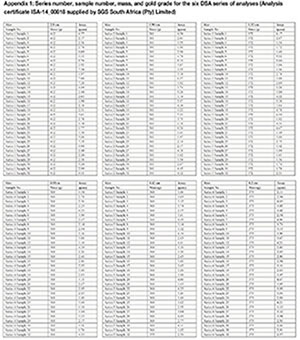 All samples were submitted for fire assay using a 50 g aliquot. The choice of aliquot was made to improve the precision of the analyses, but was permissible only because of the very good fluxing and fusion characteristics of the Witwatersrand ores. Reduction of the analytical data to provide points on the calibration curves for the DSA and the SFA methods was similar, apart from slight changes in the fragment sizes used on the curves.