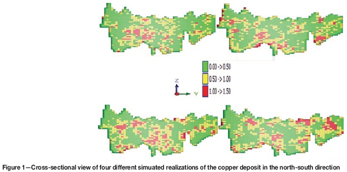 To check the capabilities and the efficiency of the proposed procedure for generating a long-term production schedule under the condition of grade uncertainty, a set of 15 simulated realizations of a copper deposit was used. Examples of these realizations are shown in Figure 1. These realizations were generated using sequential Gaussian simulation technique (SGS) (Deutsch and Journel, 1997).