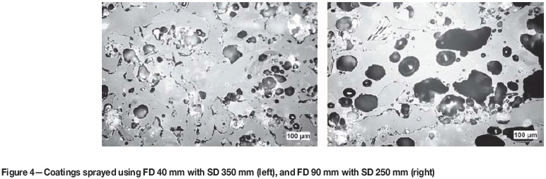 For coating production, FD varied between 40 mm and 100 mm and the SD varied between 250 mm and 350 mm. A combination of FD 100 mm and SD 250 mm was used as well, not based on the previously described optimization but in order to minimize the trajectory length where the hot powder is surrounded by reactive air.