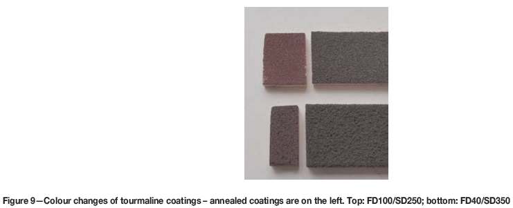 Annealing of the as-sprayed SSP and some coatings on ceramic tiles was carried out in air in a laboratory furnace using two regimes. In both regimes, the temperature was set to 1 000°C, and heating as well as cooling were done at a rate of 7 K/min. Dwell time was 30 minutes in the first case and 8 hours in the other case. Annealing temperature was chosen on the basis of the thermal analysis results so as to be above the tourmaline transformation temperature. The short and long dwell times were chosen in order to observe how much the annealing process changes the microstructure, crystallinity, and mechanical aspects of tourmaline.