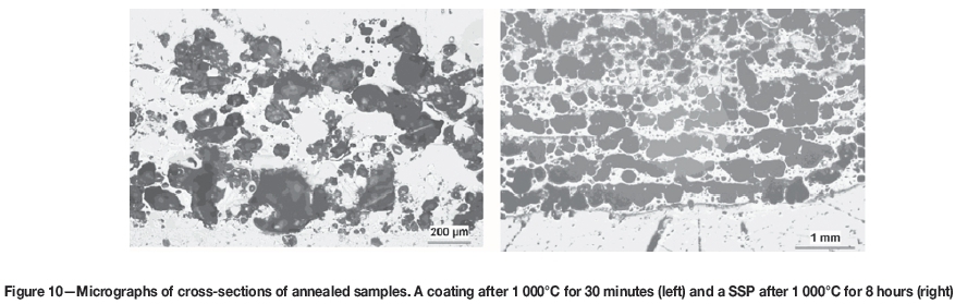 After annealing, the microstructure was almost unchanged (Figure 10). After 30 minutes the coating on a ceramic tile (left) was still porous and the extremely large pores tended to cluster together. After 8 hours the SSP tended to show pore clustering and reorientation into lines parallel with the former substrate. This sample would very likely delaminate when exposed to long-term heating.