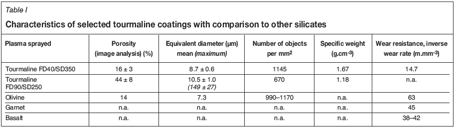 The porosity (Table I) as measured by IA was lower for FD40/SD350 coating and extremely high for FD90/SD250 coating. The equivalent diameter (ED, i.e. mean size) of pores for the second coating was about 15 times smaller than the maximum. The number of pores per square millimeter was only 670, whereas for other coatings from natural mineral feedstock it was typically much higher (Table I). This means that tourmaline pores are large and, compared to olivines (Ctibor et al., 2015a), not very frequent. The specific weight determined by Archimedes' principle was higher for the FD40/SD350 coating and lower for the FD90/SD250 coating.