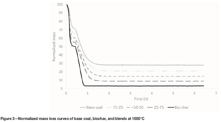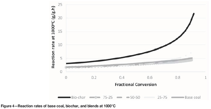 Figure 4 shows the reaction rates (g/g.h-1) of base coal, biochar, and the various blends at 1000°C. It is apparent that the reaction rate of biochar is much higher than that of the base coal and the individual blends. The high reaction rate of biochar is a well-known phenomenon and has been studied extensively (Brown, Liu, and Norton, 2000; Emami-Taba et al., 2013; Jeong, Park, and Hwang, 2014). The high reaction rate can be attributed to the high alkali metal content of biochar and weak bonds between holocellulose and lignin (Emami-Taba et al., 2013).