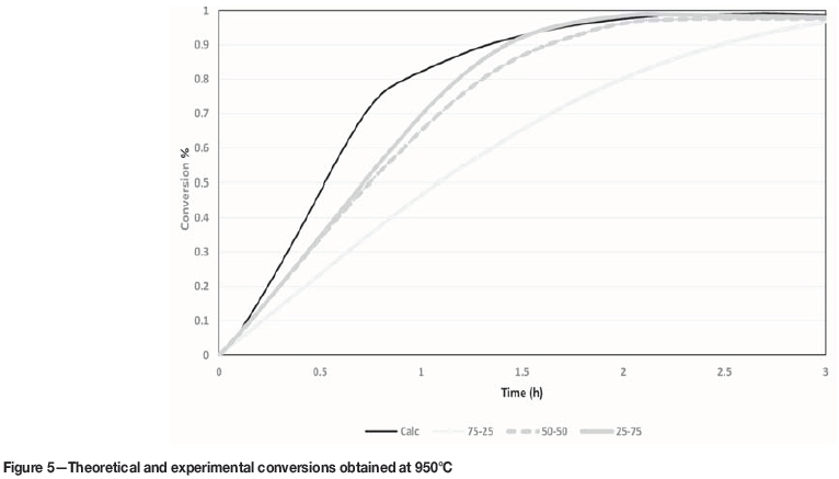 where Xcalculated is the conversion at time t of the base-case run. If Xcalculatedis larger than the experimental conversion for any blend, reaction inhibition is suspected. If Xcalculated is smaller than the experimental conversion, synergistic effects are present. Figures 5 and 6 show some sample results obtained. It can be seen that the theoretical conversion is higher than almost all of the experimental conversions, indicating that reaction inhibition is taking place. Only the 25:75 blend at 900°C (Figure 6) shows synergistic effects, which once again indicates that a lower temperature might be beneficial to the co-gasification reactions.
