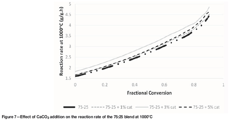 Figure 7 shows the effect of CaCO3 on the reaction rate at 1000°C. It can be seen that the addition of CaCO3 as catalyst increases the reaction rate of the 75:25 blend. The blend containing 1 wt% CaCO3 shows the smallest increase in the reaction rate, while the 3 wt% addition shows the highest increase. Some inhibition is observed when 5 wt% CaCO3 is added, considering the reaction rate is slower than that of the 3 wt% sample. The optimal catalyst addition seems to be 3 wt%. It is known that the mobility of alkali metal salts under gasification operating conditions should lead to good dispersion throughout the coal surface, resulting in an enhanced reaction rate. However, if the salt is present in excess, it can also react with aluminosilcates to form inactive alkali aluminosilicates, resulting in an observed inhibition in reaction rate, as is postulated in this study.