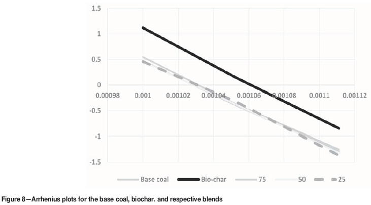 By plotting ln r versus -, the linearized Arrhenius plots were obtained. Figure 8 shows the Arrhenius plots for the base coal, biochar, and respective blends.