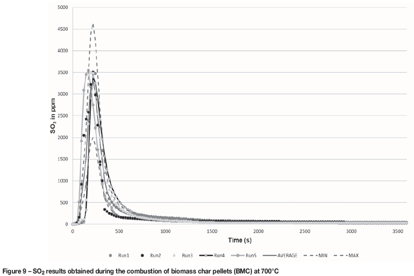 Figure 9 shows the results obtained during the combustion of biomass char pellets (BMC) at 700°C. Each run consisted of 920 mg BMC and a total of five runs were conducted in order to obtain effective repeatability results. The average, minimum, and maximum data for the five runs were plotted. The average curve was determined by taking the average data for all five runs. The average maximum peak for SO2 emissions was 3400 ppm, which was reached in the first 220 seconds. Each combustion test was completed in approximately 30 minutes.