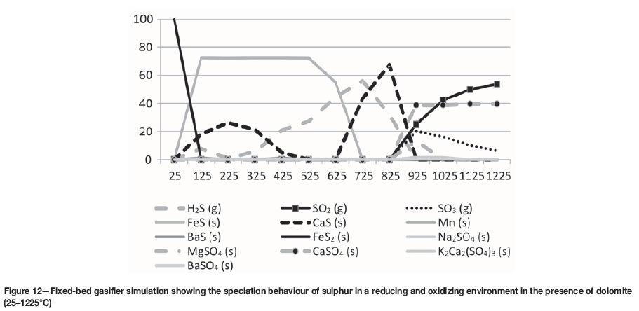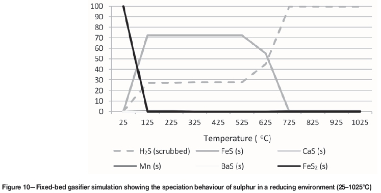 The simulation in Figure 11 shows that a CaS (s1) phase is possible at temperatures ranging between 125°C and 425°C. When the FeS solid species has finally decomposed and the dolomite has been calcined at 625°C (Equation [6]), a CaS (s2) transition state product is formed (Equation [7]), and a clear reduction in gaseous H2S is evident. At 1025°C, the fractional H2S distribution has been reduced to 24%, with the CaS (solid reaction product) accounting for the remaining 76%. This result is in fair agreement with results reported by Abbasin et al., (1990), who claimed a 90% removal of sulphur in the form of CaS during fluidized-bed gasification studies.