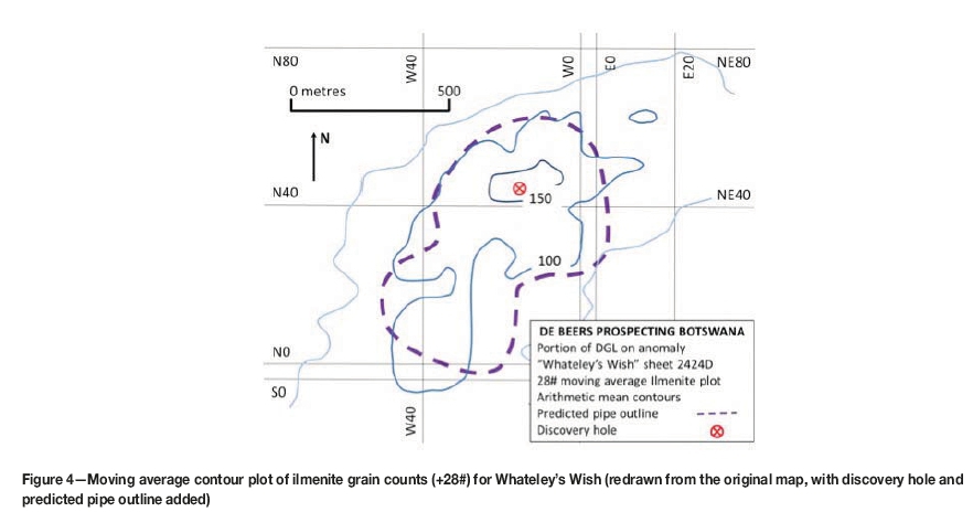 Vercoe supervised the soil sampling, assisted by Moses Rapoo, and submitted sample concentrates to an onsite heavy liquid separation laboratory with KIM grain picking under a binocular microscope. The mineral recoveries were dominated by ilmenite, with a subordinate pyrope garnet component. Despite these favourable results, grid plotting did not result in a coherent contoured plot. This may have been due to surface disturbance by cattle from the local cattle post, and/or by the thousands of annually migrating hartebeest and wildebeest, as was feared by Lamont. This author devised simple moving average and root mean square algorithms to smooth of the erratic sample counts that sometimes jumped from low single digits to hundreds, and back again in adjacent samples (Lamont, 2001). This approach, entirely manual being before the advent of field computers, proved most efficacious with a fairly robust low domal feature being defined (Figure 4).