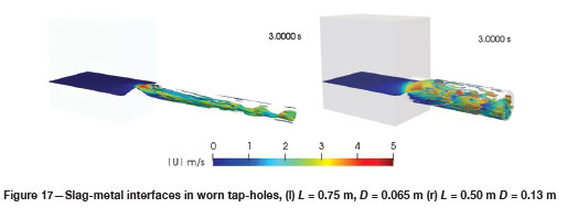 The behaviour of the deformation of the slag-metal interface is more complex. The degree of interface deformation and mixing increases at larger diameters as the Reynolds number of the flow rises and the flow becomes more turbulent. There is also a strong decrease of b{with increasing tap-hole length, suggesting that most of the interface breakup occurs close to the tap-hole entrance - longer tap-holes therefore allow more time for slag and metal droplets to recombine and settle. Interface visualizations from worn tap-hole models are shown in Figure 17 and show the effect of shorter, wider tap-holes on the slag-metal interface.