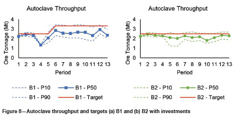 B1 invests in the autoclave expansion (Figure 8), which can be fully utilized in year 6, and has the lowest mining rate over the long-term production schedule. A comparison of the mining rates is given in Figure 9, where the resulting production rates directly correlate to the number of trucks and shovels purchased. The autoclave expansion results in lower grade refractory ore material being processed and a higher throughput at the autoclave. Over the long-term production schedule, there is a 9% reduction in the number of gold ounces produced over the life of mine compared with the P-50 of the base case scenario. However, the reduction in mining costs due to the lower mining rate overcompensates the loss in revenue and results in a higher NPV. The lower mining rate is feasible as the throughput outweighs the grade of material through the autoclave, changing the selectivity between ore and waste material. Lower utilization of the oxide processing facilities also decreases the operating costs. In B1, the optimizer has a challenging time meeting the blending constraints and is unable to provide the appropriate material to attain the blending targets, making the acid investment a critical decision for ensuring there is a suitable SS/CO3 ratio.