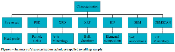 The tailings were characterized using multiple techniques to determine bulk mineralogy gold content and associations, as well as trace element chemistry. Figure 1 summarizes the different techniques applied to sample characterization and the nature of the information obtained.