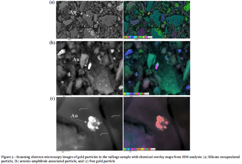 Figure 5a shows gold occluded in a silicate matrix, probably quartz, which is abundant in the sample. In Figure 5b a gold particle is associated with sulphur and arsenic in a silicate matrix. The absence of iron in the sulphur and arsenic association with gold is likely due to incomplete arsenopyrite oxidation during roasting of the host ore. The presence of Mg and Si in the silicate matrix also suggests that the mineral is an amphibole like talc. In Figure 5c a free gold particle is identified. It is therefore evident that the maximum recovery from the sample depends on effective pre-treatment strategies to release trapped gold.