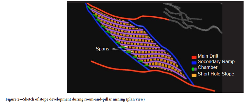 The SHRP mining method, applied by the studied mine, has a height limitation of 2.4 m. The cycle of operations starts with drilling by fan drill. After blasting, the material is removed by low-profile loaders and hauled by low-profile trucks that climb up the main ramp to the crusher. The height of all equipment cannot exceed 2.4 m. The most important access excavation to mining panels is the main ramp. This structure allows access to the main drift through haulage crosscuts. Figure 2 shows the layout of these structures applied to stope development. The main drifts are represented in red: they are always horizontal and follow the strike of the ore body. Along the main drift, there are accesses to the secondary ramps that represent the connection with rooms and short-hole stopes. The spans are highlighted in Figure 2. Figure 3 shows details of the rooms and short-hole stopes through a vertical section. In this layout, it is possible to identify the positions of the mining panels in relation to the development structures and pillars.