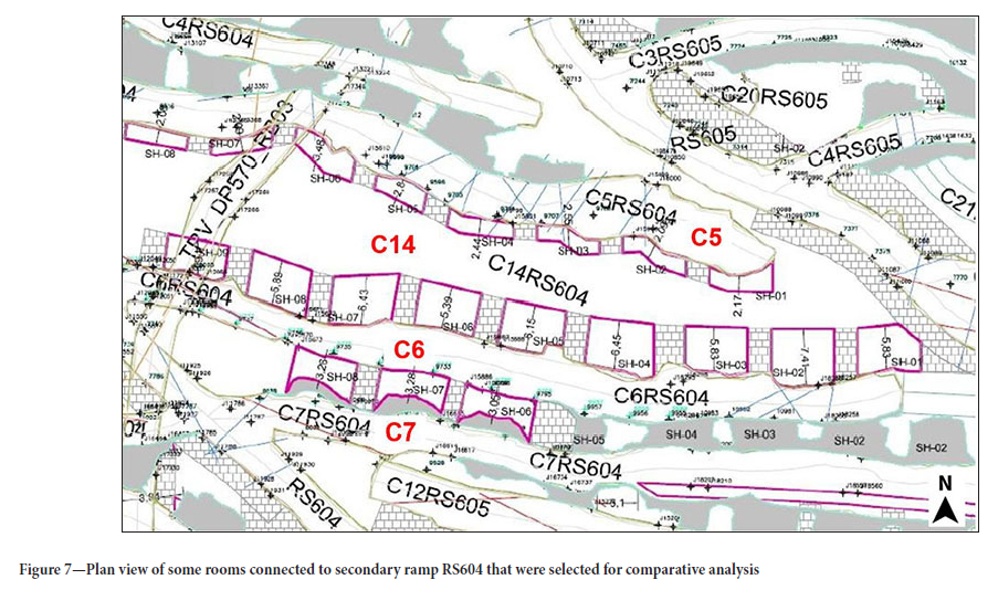 Figure 7 represents a plan view of the rooms and pillars of the mine. The figure shows the secondary ramp RS604, one of three secondary ramps selected for the study, especially rooms C5, C6, C7, and C14. The areas bordered in purple represent the short holes selected for study in this area. The area that separates them laterally represents the pillars that support the roof of the mine. In addition, the traffic of equipment in one room is isolated from the other rooms. The present study considered a total of 12 rooms that comprised 105 short holes.