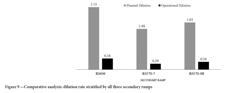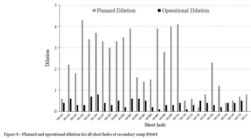 This study fulfilled the objective of developing a method capable of reducing operational dilution over traditional methods (TRP). The results indicate that the reduction in operational dilution is steady and significant. The mean operating dilution in the 105 short holes evaluated was 5.3 times lower than the planned dilution in the TRP method. The results indicate that this proportion extends to the individual short holes, because more than 96% of the short holes of the secondary ramp RS604 achieved lower operational dilution than planned. When comparing upward and downward mining areas, operating dilution remained significantly lower. Even after shift in direction along the ore body, the operational dilutions of upward and downward mining were 7 times and 2.4 times lower, respectively. These results confirm that the SHRP method is more efficient because it reduces the generation of mining waste and promotes better economic exploitation of the deposit. The SHRP method was successfully implemented. Operation dilution control is the main achievement after SHRP operational implementation.