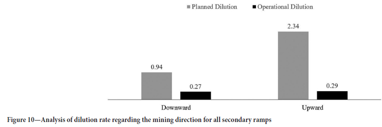 Figure 9 shows the mean PD and OD values for all three secondary accesses evaluated in the present study. These results also indicate significant reduction of the dilution for the other secondary accesses after adoption of the SHRP method. Another important aspect for evaluation is the position of the short hole according to the elevation. As the ore body has a down-dip of up to 25°, the mining direction of some short holes is upwards or downwards in the same room. Both configurations can be comparatively evaluated between the SHRP and TRP methods. Figure 10 shows the results of OD and PD for upward and downward short holes. As in other comparisons, the SHRP method had the lowest dilution in any mining direction.