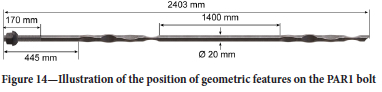 This was the same type of rockbolt selected for the investigation into the influence of the testing configuration on the performance of a paddled energy-absorbing rockbolt (Knox and Hadjigeorgiou, 2022). The PAR1 bolts used in the combination loading investigation were not sourced from the same batch of bolts as for the dynamic investigation, hence minor variations in the mechanical properties were present but these were not significant. The geometric properties of bar diameter (020 mm), rockbolt length (2.4 m), and paddle set configurations are comparable between the two rockbolts. Figure 14 illustrates the position of the anchor points (thread and paddles sets), length of the rockbolt and length between paddle sets.