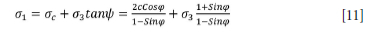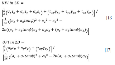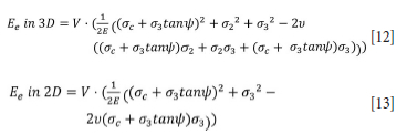 By applying the Mohr-Coulomb behaviour model to the rock sample, the maximum elastic strain energy that could be stored in the rock, is calculated using the relation [12] or [13] for 3D or 2D simulations, respectively: