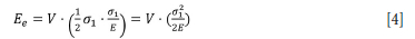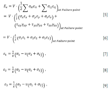 As mentioned, the unstable failure of the rock is closely related to the definition of brittle failure. Therefore, the behaviour of the rock, under unstable failure conditions up to the point of failure, can be assumed to be elastic. Also, given the maximum principal stress at the moment of failure, the elastic strain energy stored in the rock sample is: