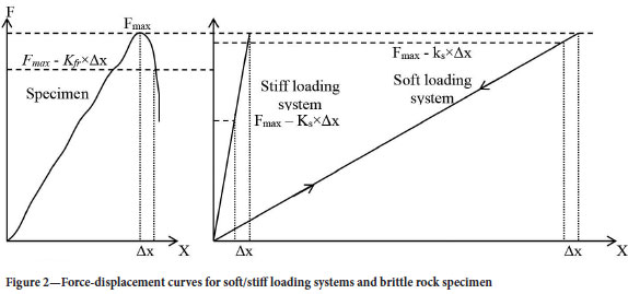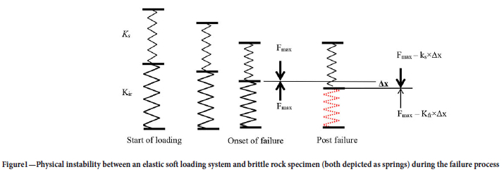 Any small displacement, Ax, applied to the end of the rock specimen past the point of failure results in two changes: 1. a change of force on rock, ksxΔx, where ks represents the stiffness of the loading system, 2. a change of force on the loading system, KfrxΔx, where Kfr represents the local slope of the post-failure force-displacement curve of the rock (Figure 2). If the loading system is softer than the rock specimen, i.e., ks < Kfr, then the total load applied on rock is greater than the load applied on the system and a net unstable load on failing rock exists that causes a violently unstable failure.