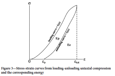 In the uniaxial compression test of a rock sample, the area below the stress-strain curve up to the peak point is equal to the maximum density of the elastic strain energy stored in the rock, and is obtained from Equation [3] (Brady and Brown, 2013).