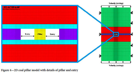 A mine pillar was simulated in a 2D plane strain condition to represent a coal pillar with its roof and floor rock masses. The height of the coal layer is set at 2.4 m, but the pillar width takes values from 1.2 m to 7.2 m in different simulations. Therefore, the pillar width-to-height ratio varied from 1:2 to 3:1. Two entries, 3 m wide, were created in the model on both sides of the pillar. On the outer sides of the entries, elastic sidewalls were modelled outward at about 40 m and were given elastic properties identical to pillar properties. A height of 80 m was given to the roof and floor rocks. The final model is shown in Figure 4. On the left and right sides of the model, roller boundary conditions were applied.