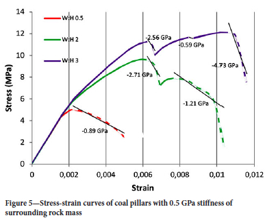 The stress-strain curves of the pillars with the width-to-height ratios of 1:2, 2:1, and 3:1, along with their post-peak behaviour, are shown in Figure 5. To plot these curves, the stresses were recorded at the base zones of the pillars. The pillar with W/H=0.5 is weaker than other pillars. Pillars with W/H=2 and 3 are stronger and show strain hardening with localized failures before the complete collapse.