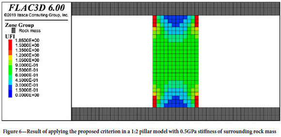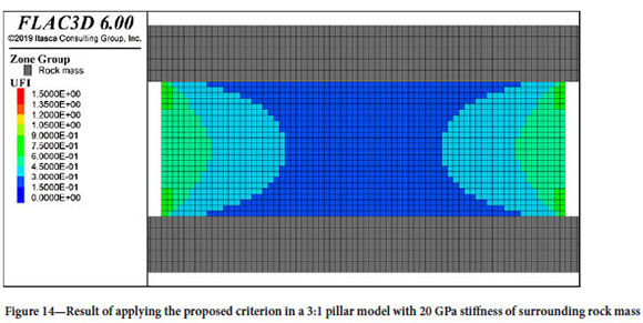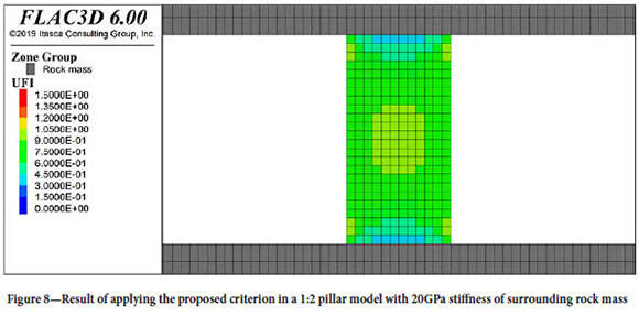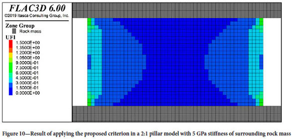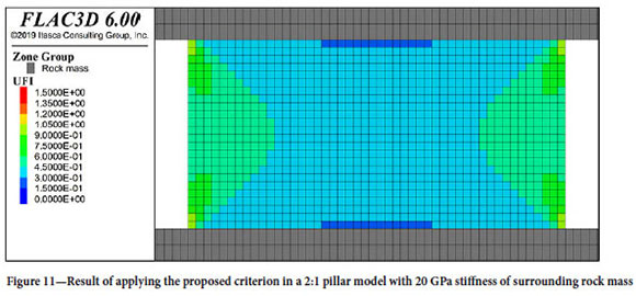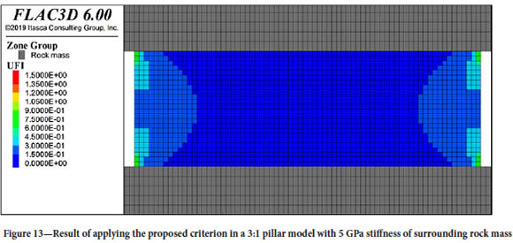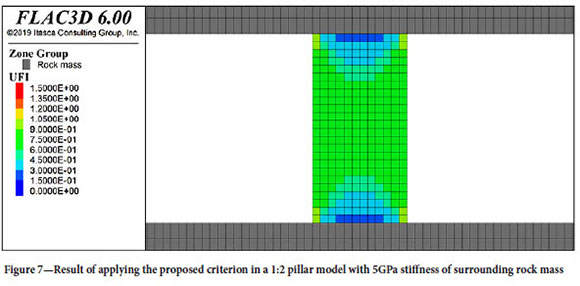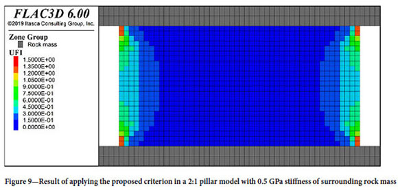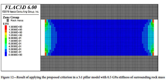 Previous criteria have been proposed only to classify and predict the intensity of rockbursts. However, the UFI index could be used in a numerical model to predict the rockburst's location (and intensity) around mining excavations. The next section presents an example of a UFI application in an FLAC3D model.
