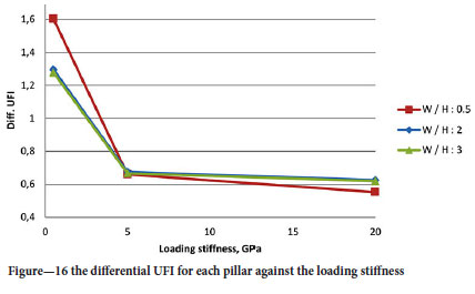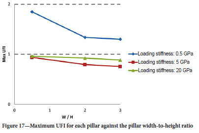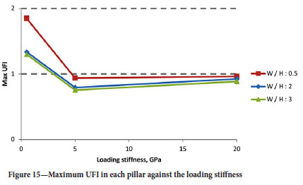 In Figure 17, the maximum UFI observed in each pillar are plotted against the ratio of pillar width-to-height. It is seen that the maximum UFI decrease with an increase in the width-to-height ratio. As this ratio increases, the potential for unstable failure decreases.