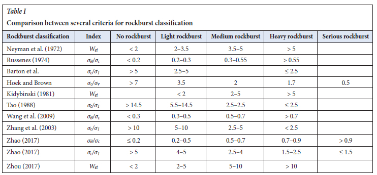 The stress/strength index, σθ/σc, was first introduced by Russenes (1974) for classifying the intensity of rockburst events. This is where σθ and σc denote the tangential stress at the rockburst location and the uniaxial compressive strength of rock, respectively. Barton et al. (1974) introduced a strength/stress index, σc/σ1, for the classification of rockburst severity. Here σ1 denotes the major principal stress at the rockburst location. Another strength/stress index, σc/σv, was used by Hoek and Brown (1980) to estimate the damage potential of rockburst in underground mines. Here σv denotes the vertical stress at the mine location. Based on these four indicators, many attempts have been made to classify the severity of rockbursts, usually into five categories: no, light, medium, heavy, and serious. Table I summarizes the different ranges proposed in this context. Subsequently, various other factors, including movement characteristics, sound characteristics, phenomenological characteristics, incision shape characteristics, time characteristics, and the degree of damage are employed to identify appropriate prevention strategies. Size of ejected fragments (d) is a factor that may be used as a rockburst descriptor: d < 10 cm for no rockburst, d = 10-30 cm for light rockburst, d = 30-80 cm for medium rockburst, d = 80-150 cm for heavy rockburst, and d > 150 cm for serious rockburst (Zhou et al., 2024).