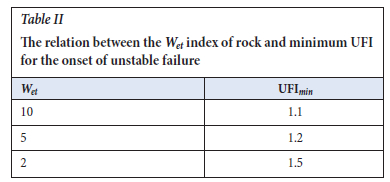 There is an inverse relationship between UFImin and Wet values. Rocks that are more brittle and have a higher Wet exhibit unstable failure at lower UFlmin values. Referring to Table I, and after using Equation [18], the minimum UFI for the onset of unstable failure are calculated as shown in Table II.