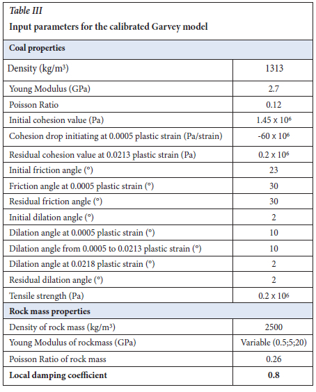Previous studies on simulating brittle rocks in a continuous medium have used the Mohr-Coulomb strain softening behaviour model to represent the deformation and strength properties of the coal seams (Badr 2004; Hobbs and Ord 1989; Garvey 2013). Therefore, in this study, the Mohr-Coulomb strain softening law is applied to the pillar model. Another reason for using this behavioural model is to reveal the natural strength reduction of brittle rocks. For this study, the model developed by Garvey (2013), which had been calibrated using the empirical Mark-Bieniawski and Salamon-Munro formulas for pillar strength, was modified to perform UFI calculations and then used to reflect the behaviour of coal pillars. The initial coal cohesion was set to 1.45 MPa, while the initial friction angle was assumed to be 23 degrees. With the introduction of a 0.0005 plastic strain, cohesion was varied with a drop rate of -60 MPa/strain. The assumption was made that the friction and dilation angles would increase when plastic deformation is introduced. Young's modulus and Poisson's ratio as the basic elastic properties are considered, 2.7 GPa and 0.12, respectively. The elastic properties of the roof and floor rocks are also adjusted based on the variable stiffness of the loading system during the tests. A square mesh with a unit size of 0.1 m x 0.1 m was used in the pillar area. In the rest of the models, a larger rectangular mesh was used to increase the calculation speed. A list of input parameters for the calibrated model is presented in Table III.