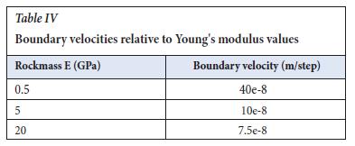 The testing process is performed by applying velocity over the upper and lower boundaries of the pillar model to increase the stress in the pillar. Note that the effect of gravity is ignored and plays no role in pillar failure. The incremental loading process via boundary displacement reduces the unstable equilibrium in the model, due to the energy released from the loading system. The velocity applied to the boundaries during each test is constant, but its value is chosen based on Young's modulus. The softer rock masses are loaded faster to reduce the time the test runs. The list of velocities applied to the model boundaries, based on Young's modulus mass values, is provided in Table IV.