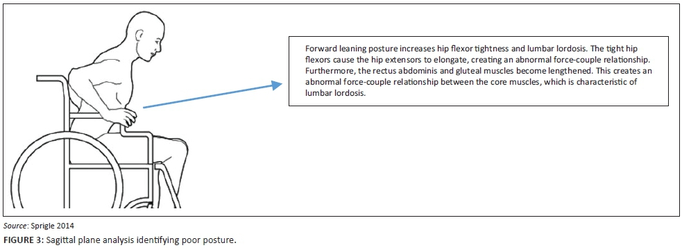 Sprigle (2014) and Will et al. (2015) stated that the key aspects of poor biomechanical posture among wheelchair users who manually propel their wheelchairs are: forward leaning and dropped or drooping shoulders. An anterior frontal plane analysis of the aforementioned pathomechanics indicates that a dropped or angulated shoulder girdle posture is associated with various shoulder pathologies (Figure 2). From this image of poor shoulder girdle posture, it is postulated that these individuals are experiencing the phenomenon known as the 'ineffective static passive locking mechanism of the glenohumeral joint'. Mansfield and Neumann (2015) describe the ineffective static locking mechanism as occurring because of scapular depression and downward rotation because of the laxed superior glenohumeral capsule and eccentrically lengthened trapezius and rhomboid muscles. This creates an abnormal force-couple relationship between the lengthened trapezius and the shortened pectoralis minor in the frontal plane (Mansfield & Neumann 2015). The shortened pectoralis minor muscles also produce a sunken chest and kyphosis. In the sagittal plane, the rounded shoulder suggests pectoralis minor and serratus anterior contractures as well as lengthened rhomboids. Furthermore, the humeral head is depressed and internally rotated indicating subscapularis contracture (Mansfield & Neumann 2015). The ineffective static locking mechanism decreases the impingement interval space between the humeral head and the coracoamical arch and this reduced impingement interval spacing produces compression of the sub-acrominal bursa, supraspinatus and biceps brachii (Mansfield & Neumann 2015). The aforementioned biomechanical cascade of events explains the pathomechanics of shoulder impingement, sub-acrominal bursitis, rotator cuff injury (supraspinatus tear) and biceps tendinopathy (Mansfield & Neumann 2015). It is recommended that symmetrical strengthening of the trapezius, rhomboid, teres minor and infraspinatus muscles and stretching of the subscapularis, pectoralis minor and serratus anterior be undertaken in order to restore correct shoulder girdle posture, increasing the impingement interval space, thereby alleviating soft tissue sub-coracoamical arch compression. Sprigle (2014) recommended that the seat width, seat depth, seat height, footrest length, armrest height, backrest height and backrest upholstery of the wheelchair be ergonomically adjusted so as to meet the individual's needs and prevent poor biomechanical posture and overuse injuries.