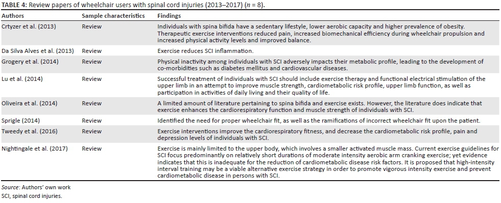 Much empirical research conducted over the last 20 years has reported the effects of sedentary lifestyles of wheelchair users as well as the benefits for those who engage in an active lifestyle (De Groot et al. 2013; Tanhoffer et al. 2014; West et al. 2014). The authors of this paper decided not only to review literature between 2013 and 2017 in order to report on the latest findings but also to include the eight review papers published between 2000 and 2013 (Table 4) so as to reflect the empirical findings of research conducted over the last 20 years (Crtyzer et al. 2013; Da Silva Alves et al. 2013; Grogery et al. 2014; Lu et al. 2014; Nightingale et al. 2017; Oliveira et al. 2014; Sprigle 2014; Tweedy et al. 2016). Previous literature indicates that the physically inactive lifestyle of wheelchair users decreases their basal metabolic rate, and increases their insulin resistance as well as their glucose sensitivity, thereby precipitating the onset of diabetes mellitus together with various other co-morbidities (Grogery et al. 2014; Tweedy et al. 2016; Jordaan et al. 2017). Kressler et al. (2014) and Tanhoffer et al. (2014) have strongly recommended that wheelchair users engage in a physically active lifestyle in order to increase their energy expenditure, thereby decreasing body fat and BMI which will positively influence their cardiometabolic profile. Van Straaten, Cloud and Morrow (2014), Kim et al. (2015) and others have reported that regular exercise and physical activity also diminish muscular and neuropathic pain, thereby improving quality of life.