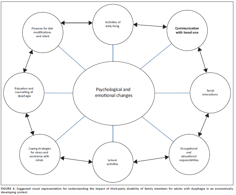 This new visual representation will assist healthcare workers in understanding the impact of TPD on family members in Johannesburg. This is important when devising home programs for adults with dysphagia. Healthcare workers would need to consider all of the aspects in the figure when considering management strategies for the home environment. It will also be important healthcare workers when counselling caregivers on what to expect upon discharge and when they are settling into a home routine. This is visual framework that has provided new information from which healthcare workers can draw for the above purposes. This can also assist in the referral process to ensure that caregivers receive the necessary support.