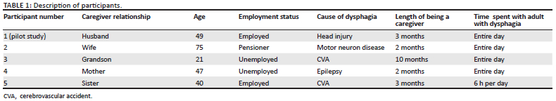 A pilot study was conducted with Participant 1 to ensure that the process of the data collection was in alignment with the aim of the study and that the data collection tools were correct. Participant 1 was a 49-year-old man who is the husband of a person with dysphagia. He is the full-time caregiver. The dysphagia and other behavioural complications of the individual were because of a head injury. A limitation was that because of the small number of recruited participants, the pilot study could only be conducted on one caregiver. No changes to the questions for the interview were deemed necessary as the researcher was able to obtain adequate data. The length of the interview was deemed appropriate, and the participant was able to respond to each question appropriately, so no rephrasing was needed. The results from the pilot study were used in the main data analysis. For the larger study, the researcher also used a reflexive journal during the data collection process for debriefing purposes and to ensure that her bias was not imposed on the data analysis as part of the rigour process. A research assistant, who was trained by the researcher, was used in the transcriptions to ensure that there was no confirmation bias and that the transcriptions were captured verbatim. The researcher and research assistant checked the transcription for accuracy and confirmability. Data were then analysed thematically using a top-down approach based on the aspects from the AC-QoL questionnaire and the ICF model that were used in the interviews and subsequent data analysis. The methodology as set out by Braun and Clarke (2006) was used for the data analysis as well as those on analysing data for a phenomenological approach in health care, which aims to describe a phenomenon, and in the case of this study, it was to describe the experiences of caregivers (Priest 2002). Table 1 describes the participants who participated in this study.