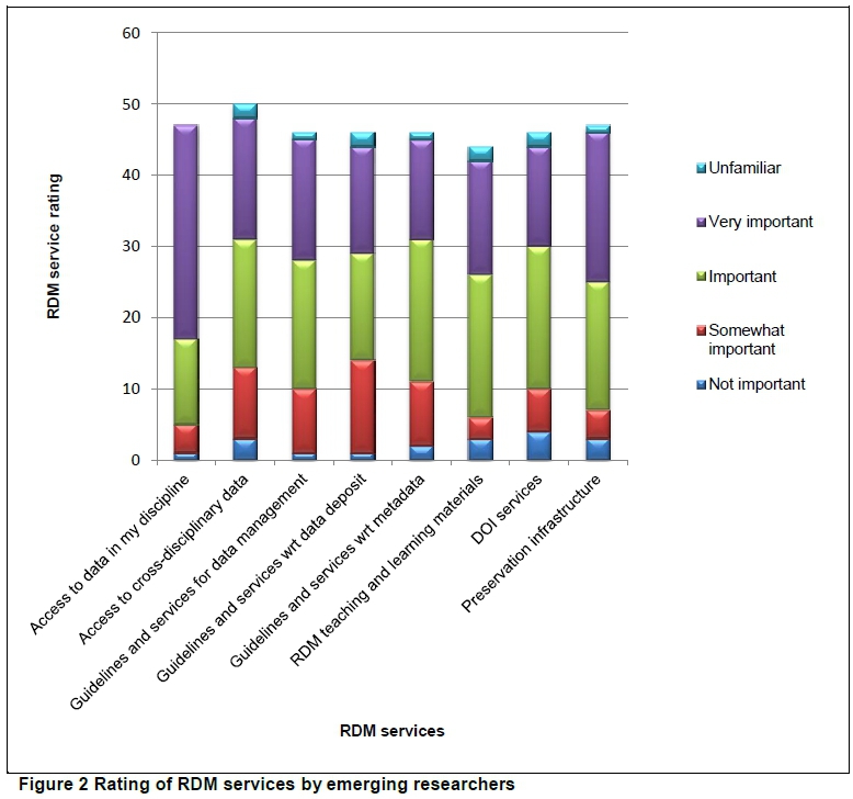 Survey results indicated that the majority of emerging researchers (88%) had never received any RDM training. RDM training per se was not a measured variable when surveying experienced researchers, but the previously-mentioned low levels of RDM awareness and insight would indicate that RDM training had in all probability not been received. Although there is no definitive proof that experienced researchers behaved similarly, the most common RDM task being performed by emerging researchers at the time of the survey was file-labelling (using standardised naming conventions), followed by storage and backup of data. Activities such as metadata preparation, adhering to a metadata standard, and keeping an inventory of data versions and/or locations of data versions, were few and far between. With a few exceptions, emerging researchers generally rated all hypothetical RDM services as either 'important' or 'very important', as shown in Figure 2 in which the results of a question asking respondents to rate the importance of several key RDM services are shown. Participants were also given the option to indicate their inability to rate a service if they were unfamiliar with it.