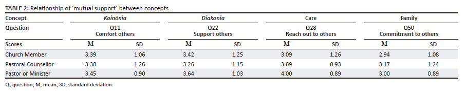 The variable of 'mutual support' within the concepts seem to indicate a relationship between concepts (cf. Table 2). The participants revealed that comfort and support of others were visible within their church congregations, and that they reached out and were committed to others.
