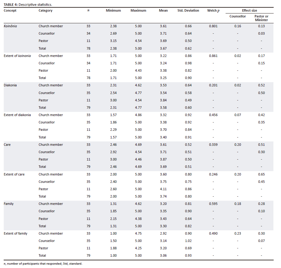 Table 4 gives a summary of the descriptive statistics that revealed there is a difference between the understanding of the concept of koinōnia, diakonia, care, and family and the extent to which these concepts are experienced when sample groups were compared.