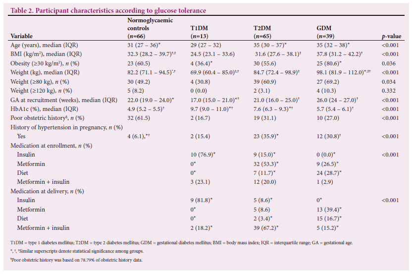 Women were included in the study if they had singleton pregnancies, were aged between 18 - 40 years, were of black African ethnicity, were at <28 weeks' gestation and were HIV negative. DIP was categorised as TIDM if diagnosed prior to pregnancy or if first diagnosed in pregnancy and was confirmed by the presence of positive antibodies or the occurrence of diabetic ketoacidosis, which is determined in consultation with an endocrinologist. A T2DM diagnosis was made if it was identified prior to pregnancy or if overt diabetes was diagnosed during pregnancy (fasting plasma glucose level >7.0 mmol/L, random plasma glucose or 2-hour plasma glucose >11.1 mmol/L on the OGTT; or glycated haemoglobin (HbA1c) >6.5%). GDM was diagnosed if carbohydrate intolerance was first diagnosed during pregnancy according to the International Association of the Diabetes and Pregnancy Study Groups (IADPSG) criteria at 24 - 28 weeks' gestation (fasting plasma glucose level 5.1 -6.9 mmol/L or 1-hour plasma glucose >10 mmol/L or 2-hour plasma glucose 8.5 - 11.0 mmol/L after a 2-hour 75-g oral glucose tolerance test (OGTT)).[13] Women were recruited as normoglycaemic controls if they had a negative OGTT. Women were followed up until delivery. Data collected included demographics, anthropometric measures, obstetric history and care, diabetes care and fetal outcomes, according to standard clinical care. Gestational age (GA) was determined using early ultrasound when available; otherwise, it was determined based on menstrual history or late ultrasound. Maternal weight at the first antenatal visit was recorded as pre-pregnancy weight was not available. Due to missing height measurements, maternal BMI data were limited. Consequently, both weight and BMI were collected. Obesity was defined as a BMI >30 kg/m2 as per Institute of Medicine guidelines.[14] Dietary counselling and education on diabetes were provided by a trained dietician. Post diagnosis, some women with GDM were initiated on metformin in consultation with specialists, while others were started on a low-carbohydrate diet (dependent on OGTT levels). Women were counselled on maintaining glycaemic targets, including fasting/pre-prandial glucose levels of <5.3 mmol/L and 2-hour post-prandial glucose levels of <6.7 mmol/L. All women with DIP monitored their glucose levels at home. Women were required to test their glucose with an On-Call Plus glucometer (On Call, Mexico) at least five times a day, at various times during the week: 30 minutes before each meal (fasting), 2 hours after each meal (post-prandial), at bedtime and 02h00. Poor glycaemic control was defined as having >25% of glucose values outside the recommended range based on home glucose monitoring.