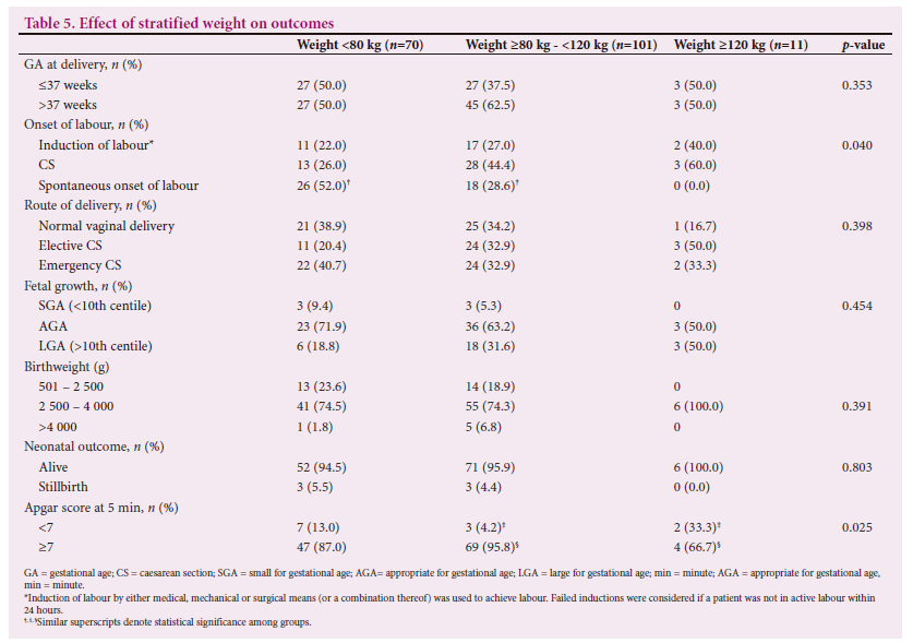 The increased risk of CS before labour onset in women who weigh more than 80 kg compared with women who weigh less than 80 kg, and the reduced likelihood of spontaneous labour onset in women who weigh more than 120 kg, further demonstrates the negative impact of maternal weight on obstetric outcomes. Abdominal operative delivery in women with obesity is known to present significant problems such as anaesthetic difficulties, infections and greater blood loss, which pose a risk to both the mother and neonate.'[24] Brost et al.[8]reported that even after controlling for confounders, any increase in maternal weight and BMI before and during pregnancy was associated with an increased risk of CS. They reported that for each incremental BMI unit (1 kg/ m2) increase, there was an approximate 7.8% rise in the likelihood of CS. This complication is thought to be due to an increase in pelvic soft tissue, resulting in the narrowing of the birth canal, leading to difficulty in delivery.[24] A study conducted in Norway reported that European/Central Asian women who were overweight or obese were at an increased risk of elective CS compared with Norwegian women without overweight and obesity, while sub-Saharan African women who were overweight or obese had the highest risk for emergency CS compared with normal-weight women from Norway.[7] A study by Wolfe et al.[10]reported that calculating maternal BMI offers no advantage over simply using maternal weight in the initial risk assessment of outcomes related to maternal weight. This practice should be considered for risk assessment of pregnant women instead of BMI, especially in busy, resource-limited settings.