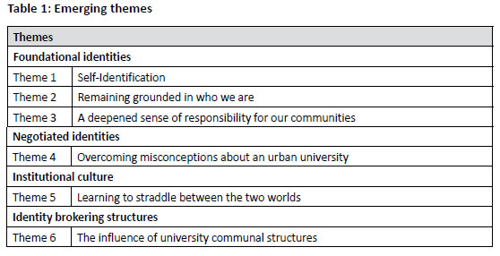 Given the South African context, one might expect race to be a dominant feature in the respondents' identity discussion; however, it was notably not a defining factor of their self-identity. This might indicate that they viewed it as intrinsic to them, and as therefore not worth mentioning. They focused on self-identification by place, background, values, principles, poverty, possessions and community. Only three of the twelve respondents mentioned race as a defining factor. One message was consistent throughout their narration: that the respondents received foundational values from home which subsequently informed their self-identity. When they reached university, the self-identities influenced by home adjusted slightly, without loss of their foundational identities. New identities were constituted in the new environment, influenced by ideals, values and lessons from the new community.