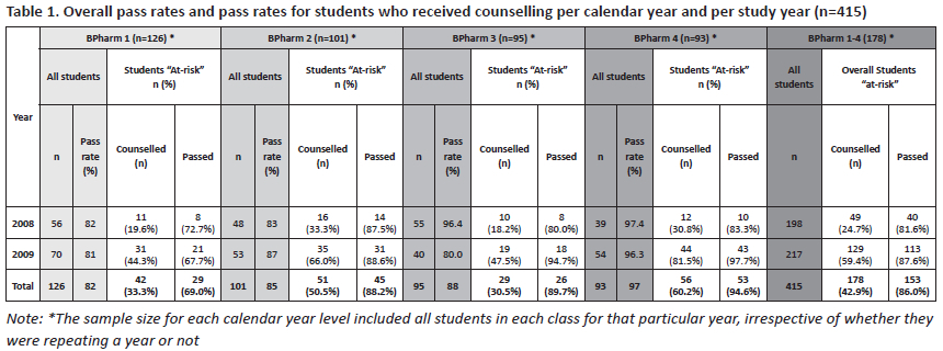 Students in the BPharm programme who obtained less than 50% (minimum pass rate) for a particular assessment in a module were identified as at risk to fail the particular module and subsequently the year and received individual counselling. Table 1 shows a summary of the students' pass rates in the two study groups per calendar year (2008 and 2009) and per study level of the 4-year BPharm programme, distributed by overall pass rates and pass rates for at-risk students who received counselling. More than a third of the students from the two groups received individual counselling because of their poor academic performance (178/415; 42.9%), of whom the majority (153/178; 86.0%) succeeded in their respective years.