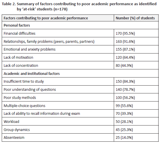 In this study, the vast majority of the students indicated interpersonal challenges (91.6%) (i.e. strained relationships with their parents, peers and partners), and anxiety (87.1%) as factors contributing to their poor performance. In addition to 84.3% who identified not having sufficient time to study as a reason for poor performance, 89.3% also identified improving their time management as a strategy to improve their academic performance. Poor time management and emotional challenges experienced by students in this study could be associated as previous research has shown that poor relationships with parents, partners, friends, and siblings can contribute to a student suffering academic stress (Kim & Lee, 2013). Furthermore, the literature has shown that emotional or anxiety problems and lack of motivation can lead to phobia of examination rooms or assessments, leading to post-traumatic stress disorder and lack of time management (Afolayan et al., 2013). Low self-esteem and disengagement can also lead to high academic anxiety and stress (Sharma & Jagdev, 2012). Students' psychological factors are notable, as 92.7% requested and agreed to be referred for assessment and counselling by a professional psychologist at the university. This kind of referral is essential to minimise anxiety and stress levels, which, if not addressed in time of need, may limit educational and professional development and promotion through the educational system (Fazel et al., 2014) or result in students leaving the programme without completion (Afolayan et al., 2013).