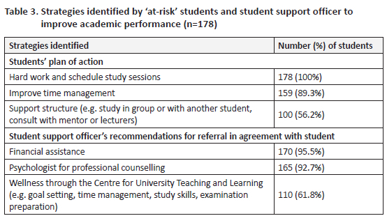 At the end of each individual counselling session, at-risk students had to indicate in writing what their individual strategies were in terms of a way forward to improve their poor academic performance. Table 3 shows a summary of the strategies identified by at-risk students, including recommended referral for support by the university. All the students (100%) agreed that they needed to work harder and schedule specific study sessions, followed by improving their time management (89.3%). More than half of the students attending individual counselling sessions (56.2%) opted to improve their performance after the session by using their support structure, such as studying in a group, and having consultative sessions with their mentors or lecturers within the BPharm programme.