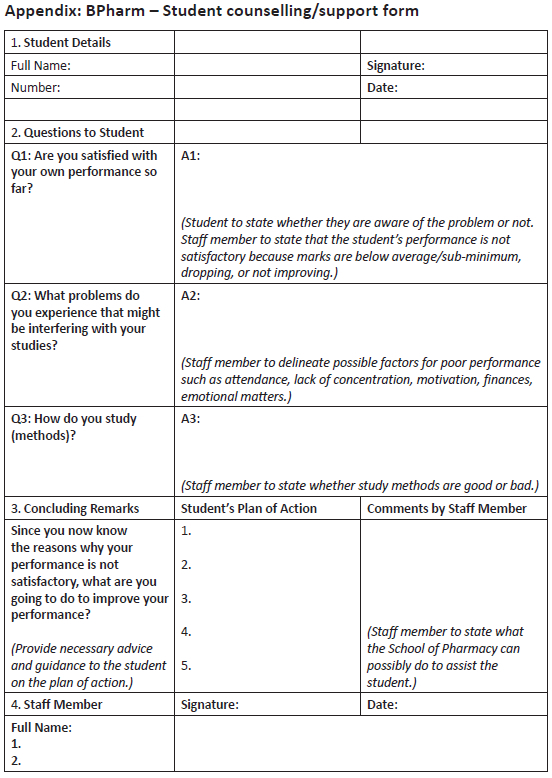 Based on the experience from the individual counselling process used in this BPharm programme, the results showed that at-risk students are distributed across all the programme levels. The students themselves identified various reasons for poor performance and the required supportive strategies. Therefore, the BPharm programme would benefit from a more structured student support and mentoring programme, considering these factors. Academic and personal performance should be tracked periodically at an early stage of the student's academic life to allow referral for professional support, whether financial, psychosocial or wellness where appropriate. Measures should be in place to ensure a timely turnaround time to optimise these efforts. In addition, those referred for support should be monitored to ensure they are attending their sessions. Students should seek assistance from an earlier stage in their academic programme to prevent the identified challenges affecting their senior years' performance. Hence, such a programme should also include pathways for the students themselves to obtain support from peers, mentor(s) and teaching staff at an early stage or whenever the need arises. Academic staff should be sensitive and accessible when students approach them, as these students considered at risk are epitomised as individuals with specific needs and special issues (Mngomezulu et al., 2017).